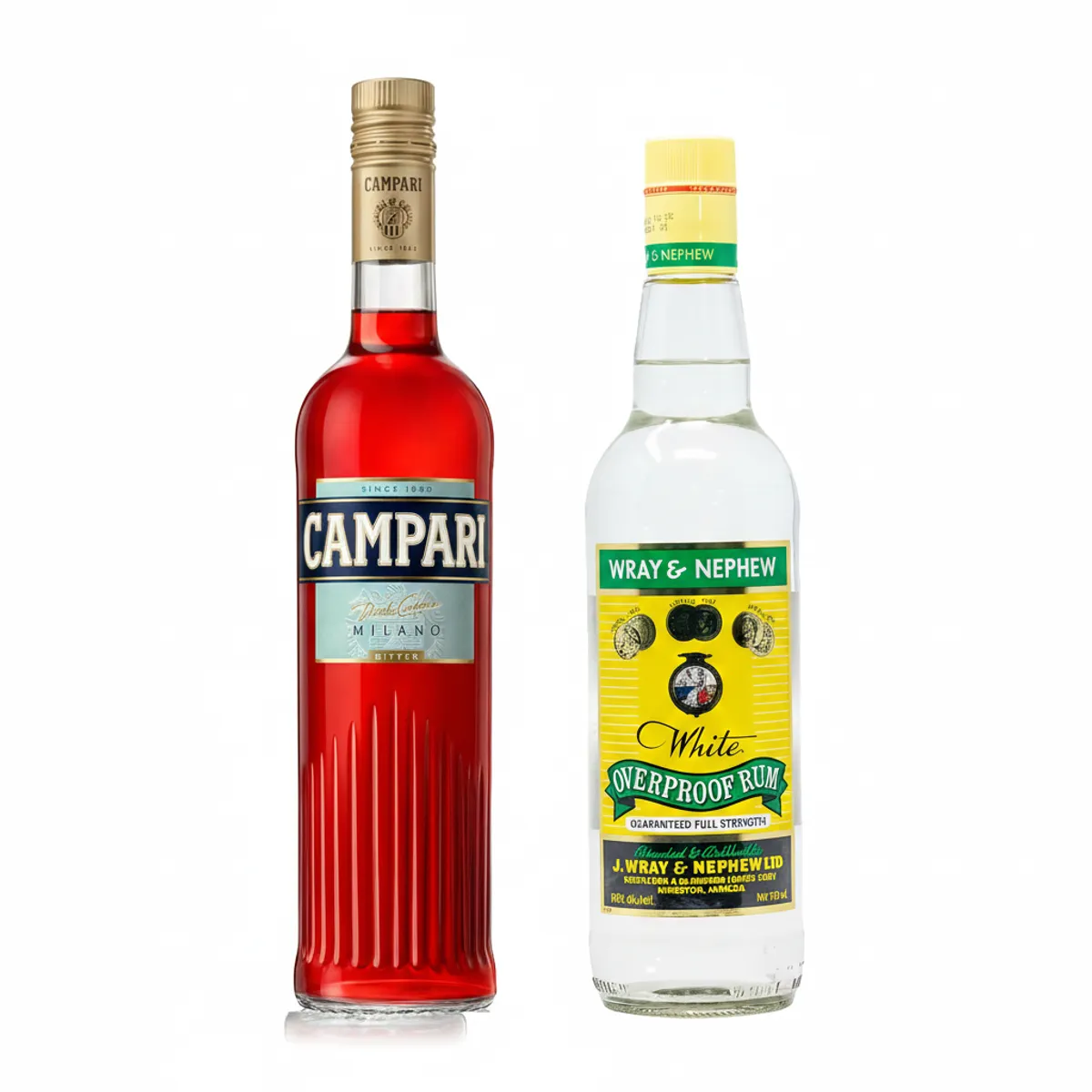 Wray & Nephew Overproof Rum is a true Jamaican staple, known for its bright clarity, natural fruity aroma, and bold character that comes from a special blend crafted at the historic Wray & Nephew estate. Its signature flavor makes it essential for authentic Jamaican rum punch, traditional “secret” mixes, or simply enjoying neat or on the rocks. Campari, on the other hand, embodies Italian elegance with its vibrant red hue, herbal and citrus notes, and unmistakable bitter profile. At 28.5% ABV, this iconic aperitif adds sophistication to both classic and modern cocktails, offering a refined, stylish experience for discerning palates.