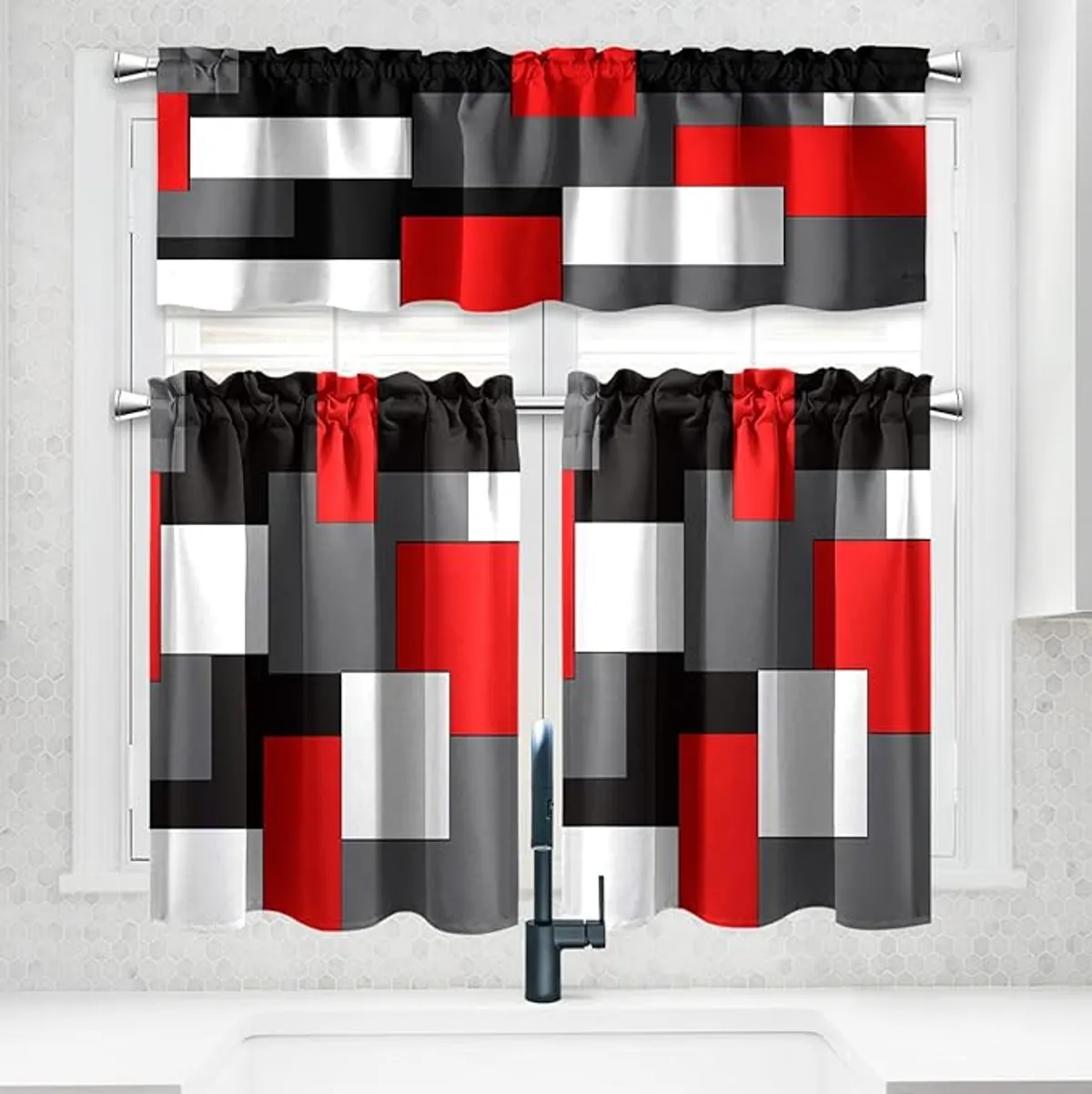 Red Black Grey White Kitchen Curtains and Valances Set 3 Piece Red Abstract Art Kitchen Curtains Set 36" Window Tier | 7Krave Marketplace