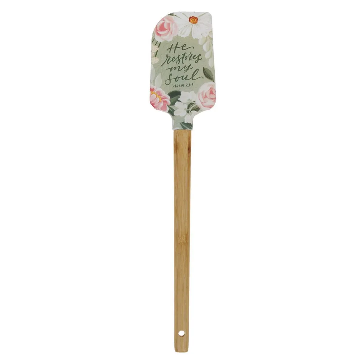 Bring God into the mundane daily tasks when you use the He Restores My Soul Green Floral Garden Silicone Spatula to cook or bake in your kitchen. With its elegant design, this versatile kitchen tool will bring joy with each stir. The bamboo handle meets the BPA-free silicone head of this spatula to create a slick design that is comfortable to hold. The sturdy silicone head features a light green background with pink and white flowers circling the edge. The floral pattern leaves a space in the middle to display the Scripture sentiment. He restores my soul Psalm 23:3 The double-sided silicone head features the same design on the back. The sustainable bamboo handle and flexible but sturdy silicone head make this spatula a durable and long-lasting choice for mixing, flipping, and stirring. A hanging hole at the bottom of the bamboo handle allows for easy storage. The spatula is dishwasher safe, heat-resistant to 320 degrees Fahrenheit, and gentle on all types of cookware to prevent scratches. It is made from food-safe silicone, and its detachable head makes the spatula easy to clean. This silicone spatula head is wrapped in a cardboard sleeve before the entire time is shrinkwrapped for protection. The He Restores My Soul Green Floral Garden Silicone Spatula is part of the He Restores My Soul Green Floral Garden Collection, which also includes a spiral journal, a stainless steel tumbler, a vase, a candle, a spatula, a Bible cover, a set of prayer cards, a pill case, a note block and pen combo, a small notebook, a compact KJV Bible and a die-cut magnet. This collection offers delightful floral motifs and peaceful encouragement from Scripture on a variety of gifts for women. This spatula can handle all your kitchen tasks, from stirring a boiling pot of pasta to spreading frosting on a cake to flipping a pancake. Perfect as a housewarming gift, bridal shower present, or stocking stuffer, the He Restores My Soul Green Floral Garden Silicone Spatula will bring a touch