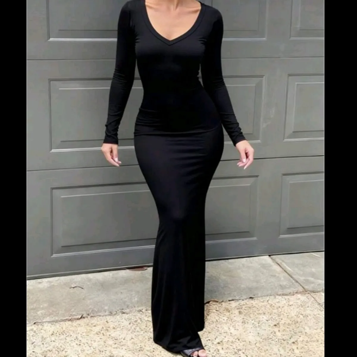 Women's Black V-Neck Long Sleeve Slim Fit Dress-Size-l | 7Krave Marketplace