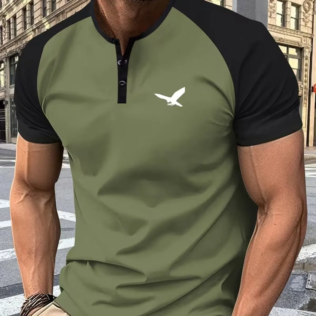 Men's Raglan Short Sleeve Henley T-Shirt - Color-Block Design with Eagle Logo Print, Breathable Fabric Size L | 7Krave Marketplace