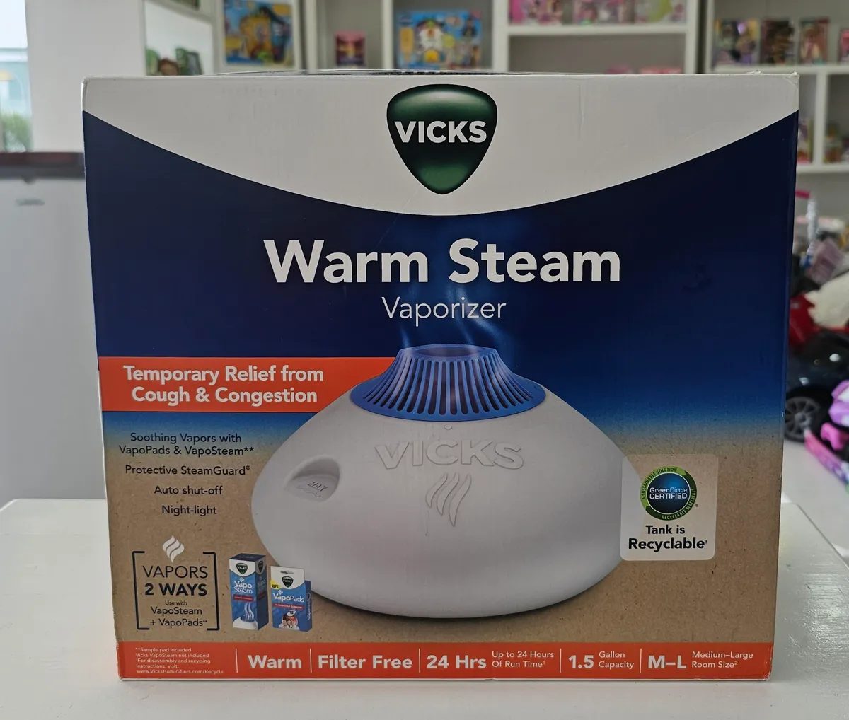 Get the relief that you need with the Vicks Warm Steam Vaporizer. It helps temporarily relieve cough and congestion symptoms so you rest more comfortably at night. This Vicks V150SGN features an automatic shut-off when empty and large night light. There s room for up to 1.5 gallons of water inside this humidifiers for homes. For additional comfort these Vicks humidifiers have a medicine cup that works with the coordinating VapoSteam which medicates the mist as a cough suppressant. These home room humidifiers also come with dual scent pad slots for use with Vicks VapoPads for some soothing aromatherapy. These Vicks humidifiers for bedrooms make for a thoughtful gift idea for a birthday holiday or any other occasion.
