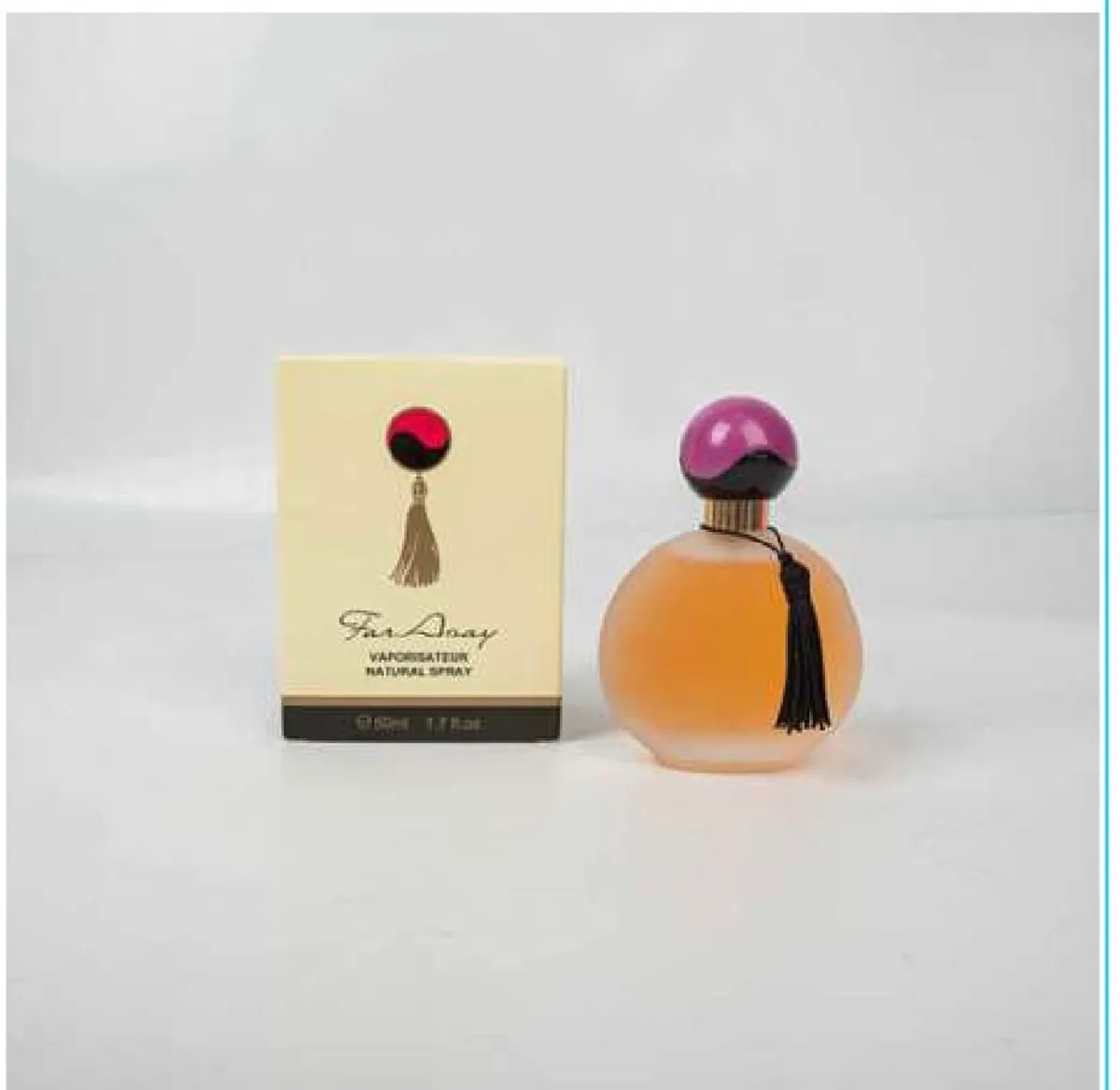FAR AWAY, A FEMININE LUXURIOUS NATURAL VAPORISATEUR SPRAY FORMUL FRAGANCE THAT LEAVES A LASTING ELEGANT SCENT. FOR A FRESH ALL DAY AROMA THAT FEELS "FAR AWAY" FROM ORDINARY SCENTS TRANSPORTING THE WEARER TO AN UPSCALE SOPHISTICATED VIBE. AT 50ML / 1.7 FL. OZ. THIS IS A CROWD'S FAVORITE. PRESENTED IN A SLEEK, PEACHED COLORED ROUND BOTTLE WITH A PURPLE CAP TOPPED BY BLACK TASSLE. THE PACKAGING FEATURES A CREAM BOX WITH A MATCHING RED AND BLACK TASSLE DESIGN