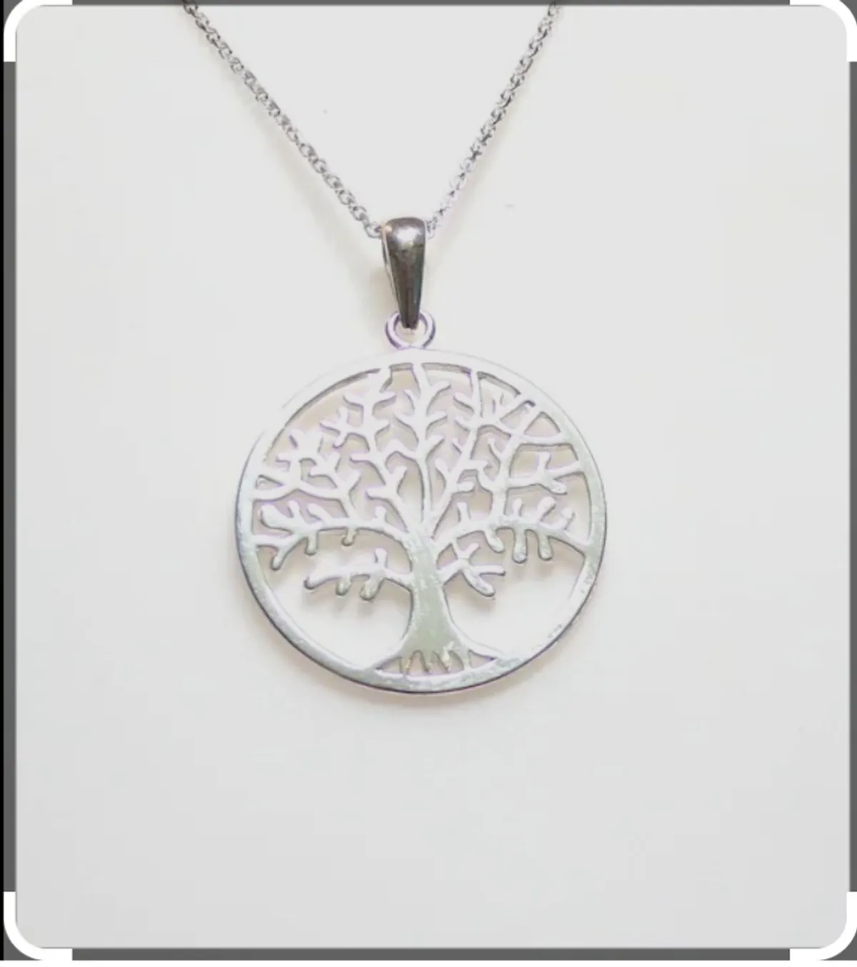 This piece is a Tree of Life pendant necklace, a popular jewelry design symbolizing immortality, knowledge, and the healing of the soul. The necklace features a circular, openwork pendant with a detailed tree silhouette, often crafted from sterling silver (925 silver) Real silver