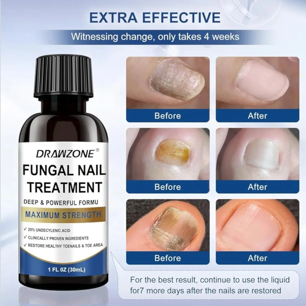 This unique formula penetrates and absorbs into the skin around each infected nail, providing nail growth treatment for healthier nails. The formula is very strong and effective, with the highest amount of undecylenic acid at 25% and tolnaftate at 1. Clinically proven ingredients will help restore healthy toenails. Additionally, it aids in restoring nails and combating the effects of fungal damage and discoloration in both toenails and fingernails, which may appear yellow, thick, dark, brittle, broken, cracked, or lifted. Apply it to the cuticle base and the edge of each infected nail once a day. Allow the solution to soak for five minutes for optimal results. It is non-greasy, non-staining, and economical.