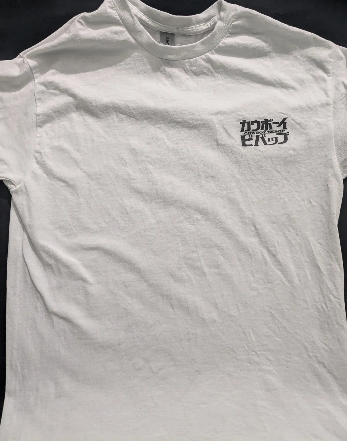 White crewneck Gildan Heavy Cotton T-shirt with a 2.5"x1.5" black Cowboy Bebop title card patch on the left chest area. Shirt and patch colours can be changed on request free of cost. Medium shirt used in display but any size can be ordered on request free of cost.