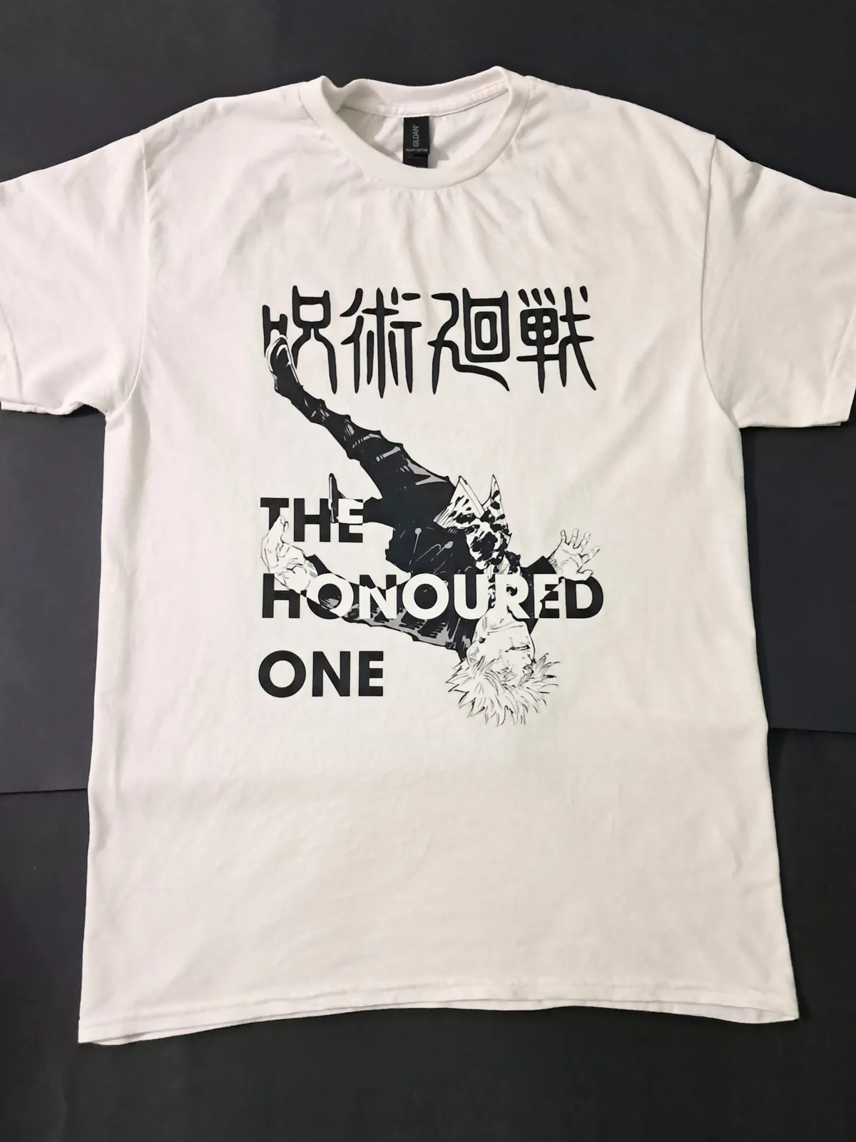 White crewneck Gildan Heavy Cotton T-shirt with a 10"x14" Gojo edit on the front and a 10"x14" quote on the back Shirt and image colours can be inverted on request free of cost. Medium shirt used in display but any size can be ordered on request free of cost.