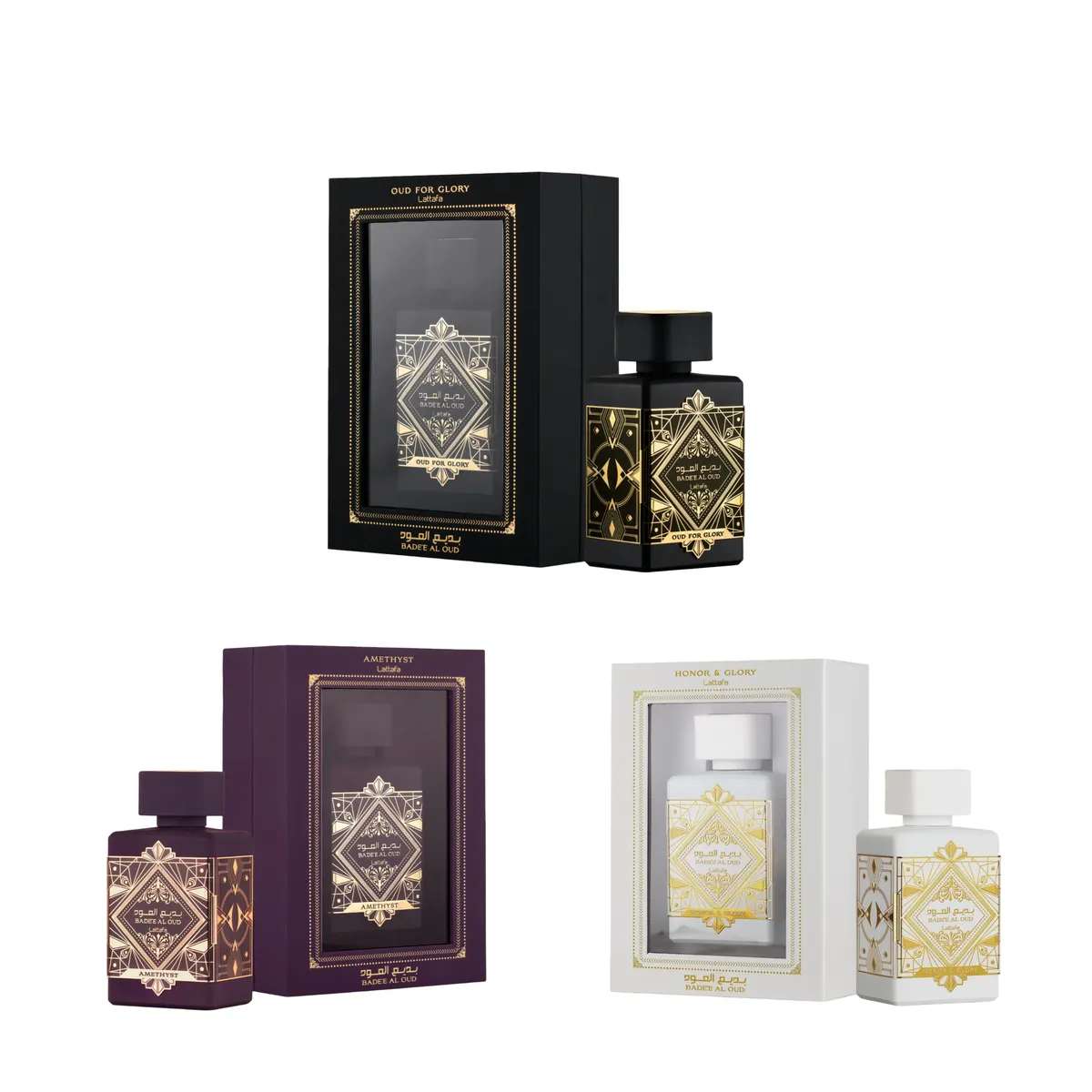 ✨ Oud For Glory (Black Bottle) – Bold & powerful with deep oud, spice, and warmth. A true statement fragrance. 💜 Amethyst (Purple Bottle) – Smooth, fruity-floral elegance with a woody twist. Perfect for everyday wear. 🤍 Honor & Glory (White Bottle) – Clean, versatile, and sophisticated. A fragrance that works anytime, anywhere. ✔️ You Get All 3 Bottles (100ml Each) ✔️ Unisex fragrances – perfect for him & her ✔️ Long-lasting Eau de Parfum ✔️ Great value bundle – luxury scents at one price