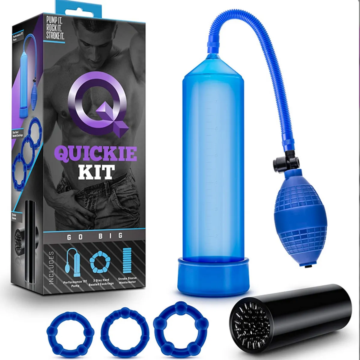 Quickie kit is nothing but rock hard fun! The Go Big Kit includes a Performance 101 pump for erectile engorgement three Beaded Rings for the base and/or shaft to hold that pumped up pressure and a body safe and incredibly soft Stroke Sleeve to take you over the edge! Pump it. Rock it. Stroke it.
